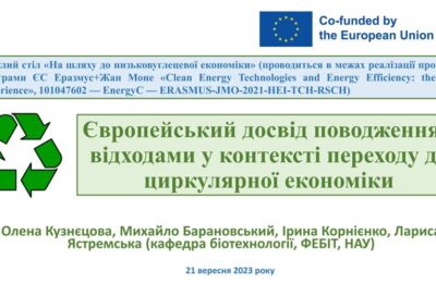 21 вересня 2023 року на кафедрі біотехнології факультету екологічної безпеки, інжененрії та технологій Національного авіаційного університету відбулося засідання круглого столу «НА ШЛЯХУ ДО НИЗЬКОВУГЛЕЦЕВОЇ ЕКОНОМІКИ» (TOWARDS LOW CARBON ECONOMY). Захід проводився в межах реалізації проекту програми ЄС Еразмус+ Жан Моне «Чисті енерготехнології та енергоефективність: досвід ЄС (101047602 — EnergyC — ERASMUS-JMO-2021-HEI-TCH-RSCH) В ході роботи круглого столу «На …