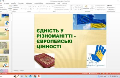 31 травня 2023 року відбулася година корпоративної культури для групи ЦПБ-105 (спеціальність – 263 ««Захист об’єктів критичної інфраструктури») на тему: «Єдність у різноманітті – Європейські Цінності». Наставник групи Синило К.В. представила презентацію, яка була присвячена культурним, економічним, соціальним та науковим пріоритетам Європейського союзу.