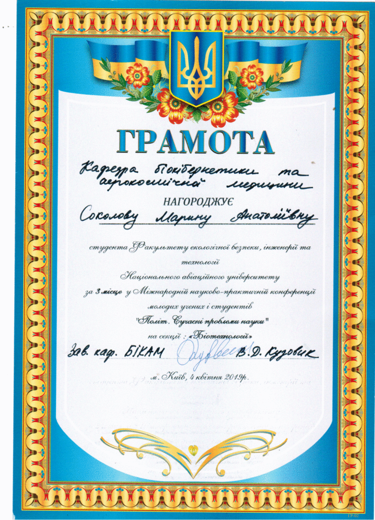 On December 3, 2019 at the Department of Biocybernetics and Aerospace Medicine, a student scientific-practical conference “Modern problems and prospects of biomedical engineering” was held. reported on their developments) After a short vote, the 1st place was given to Trofimets B.Yu. with the report “Methods of research of human brain fatigue” (Scientific Candidate of Technical Sciences, Assoc. Prof. Burychenko M.Yu.), 2nd place – Yu. “Methods of control of the physiological condition of the pilot during flight” (scientific supervisor Ph.D., Assoc. Prof. Monchenko OV).
