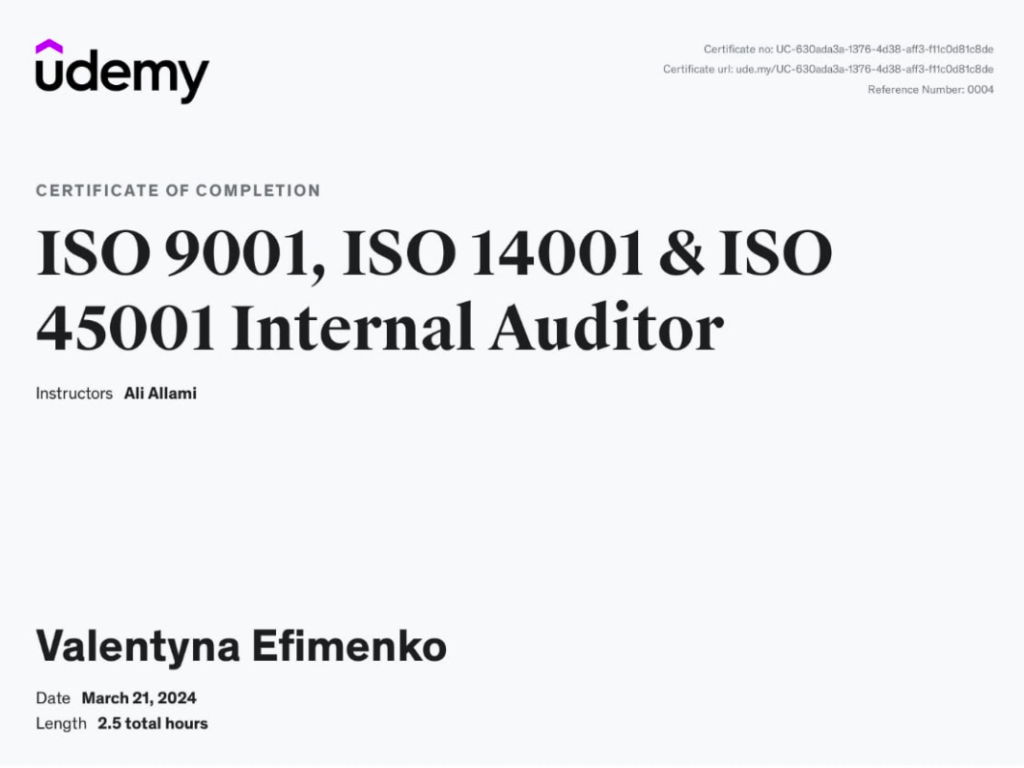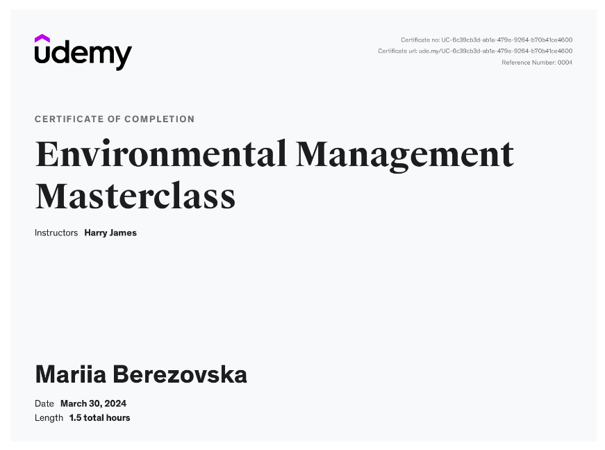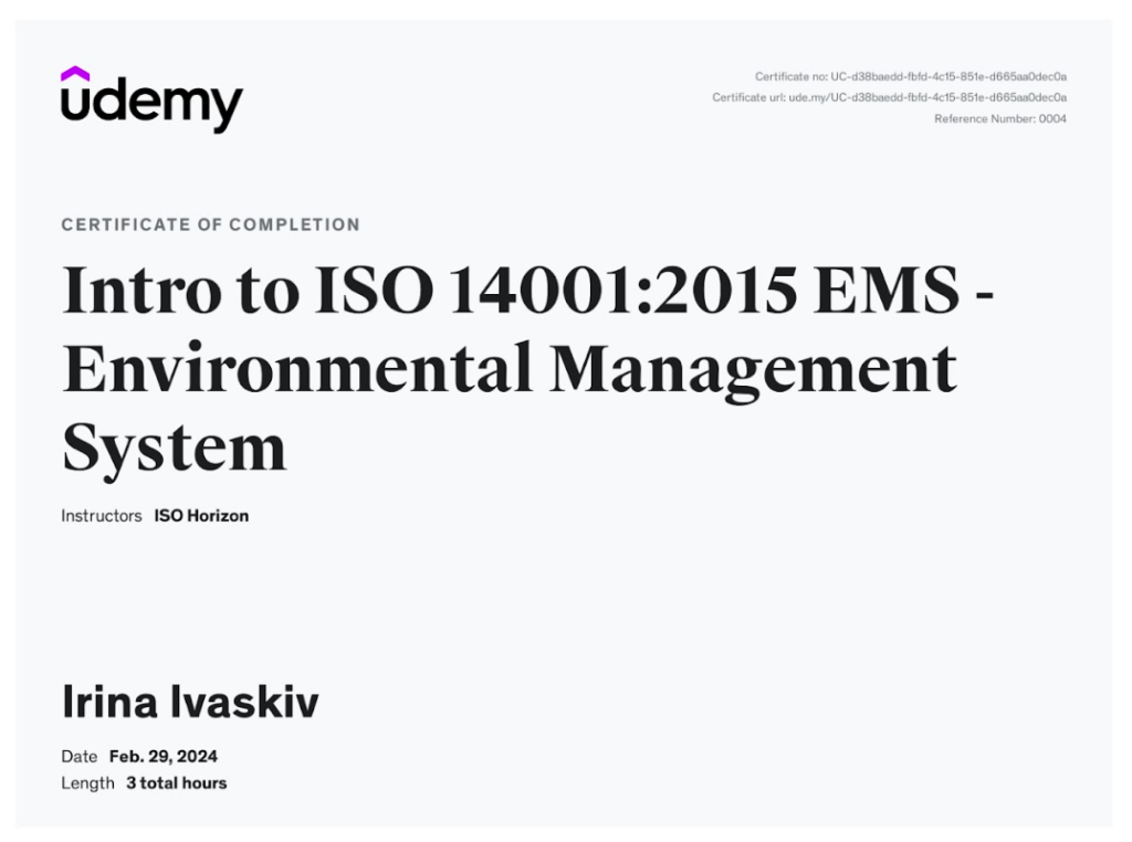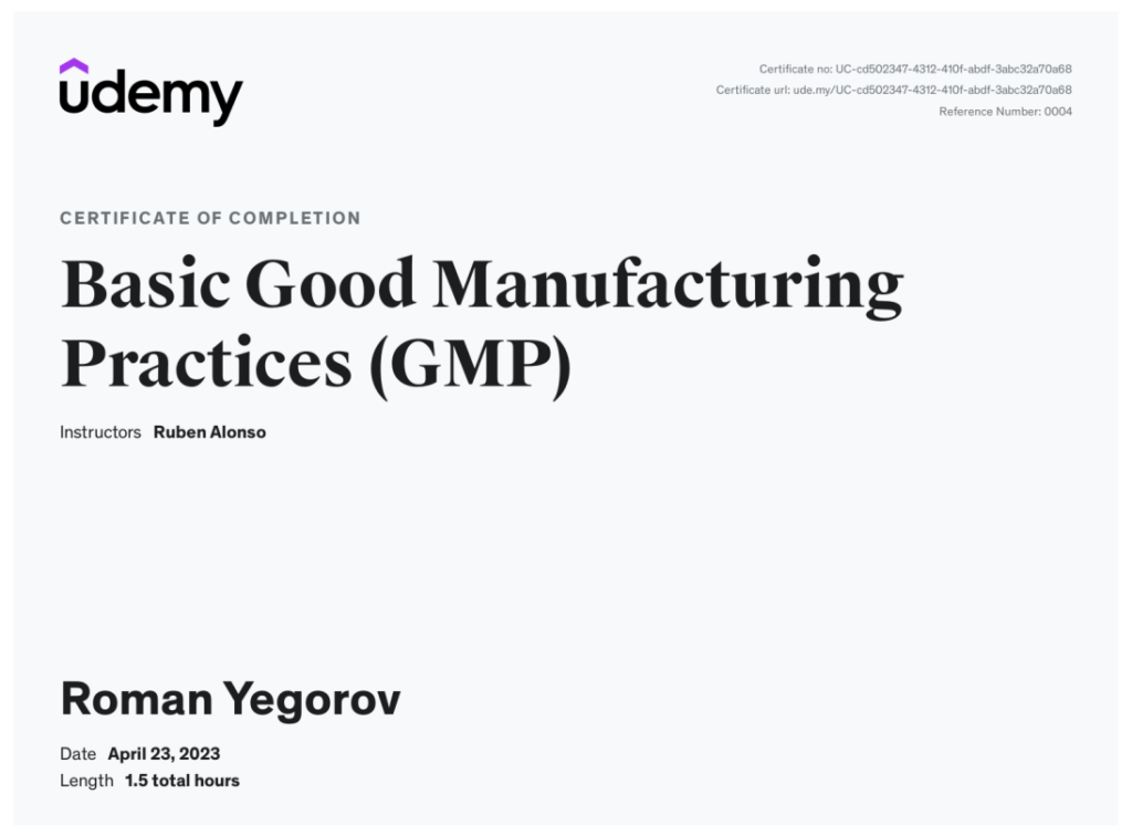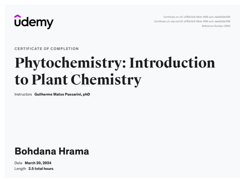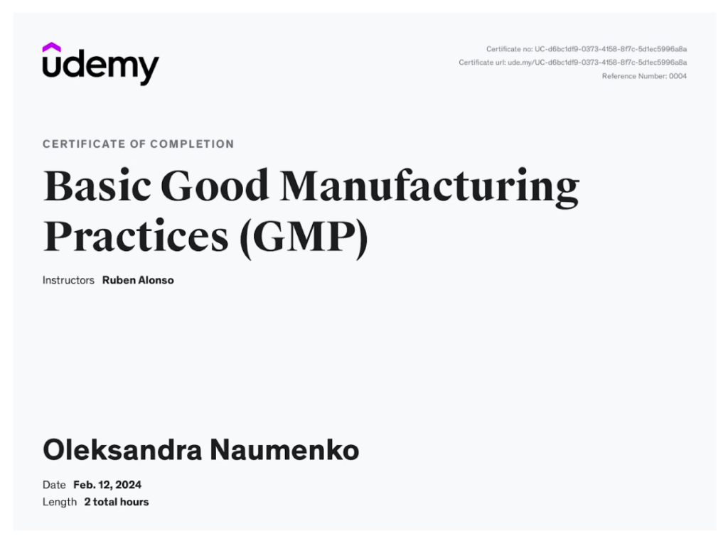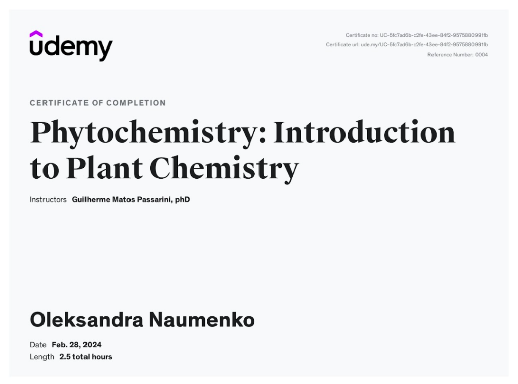 У 2023-2024 навчальному році здобувачі вищої освіти англомовних груп бакалаврату та магістри першого курсу спеціальності 162 “Біотехнології та біоінженерія” активно використовували можливості неформальної он-лайн освіти. Студенти проходили тренінги на платформі бізнес-курсів Udemy та отримали відповідні сертифікати, які у майбутньому зможуть додати до своїх резюме. Цього року студенти поглиблювали знання з належної виробничої практики (GMP), фітохімії, екологічному менеджменту та аудиту.