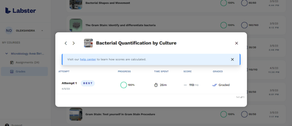 У ІІ семестрі 2022-2023 навчального року здобувачі вищої освіти кафедри активно використовували можливості порталу Labster при виконанні завдань лабораторних робіт з багатьох дисциплін. Нижче наведено декілька прикладів результатів виконання он-лайн симуляцій.