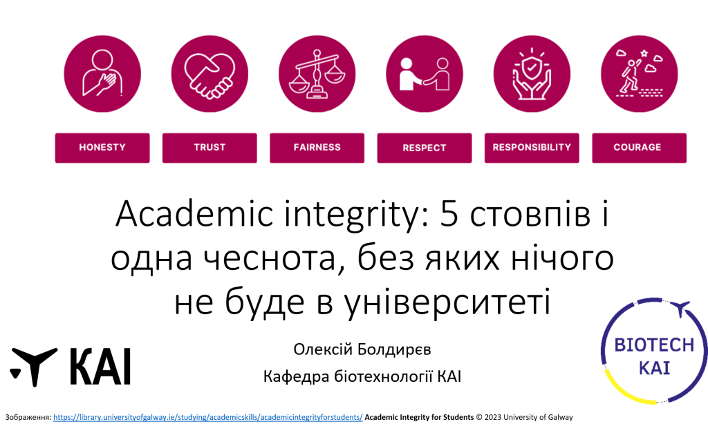 На засіданні кафедри 8 листопада 2024 року в. о. завідувача кафедри біотехнології Олексій Болдирєв виступив з лекцією про принципи academic integrity за матеріалами International center for academic integrity.