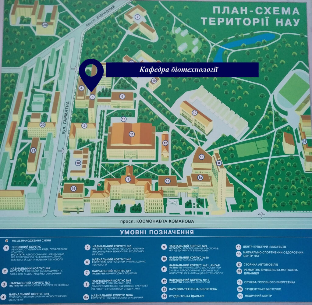 Україна, 03680, м. Київ-58, пр. Любомира Гузара 1, КАІ, корпус 5, кім. 5.709, кафедра біотехнології