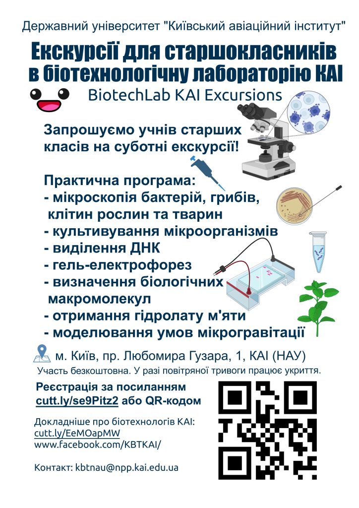 Запрошуємо учнів 9-11 класів на екскурсії в біотехнологічну лабораторію Державного університету “Київський авіаційний інститут”. Спробуйте зануритись у лабораторне життя біотехнологів та дізнатися більше про перспективну професію.