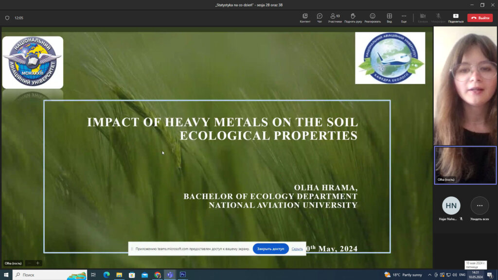 10.05.2024 року Ольга Грама, студентка 2-го курсу кафедри екології ФЕБІТ (науковий керівник доцент кафедри екології Черняк Лариса) представила результати експериментальних досліджень впливу авіаційної діяльності на навколишнє середовище у вигляді доповіді на The 3rd Interdisciplinary Student Scientific Conference «Statistics in Everyday Life», що була організована Факультетом Інженерного менеджменту Білостоцького технічного університету (м. Білосток, Польща).