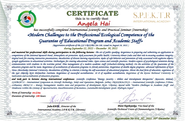 2. Тема: Modern Challenges to the Professional Ecological Competence of the Guarantee of Educational Program and Academic Staff, 12.09.2022-30.12.2022.