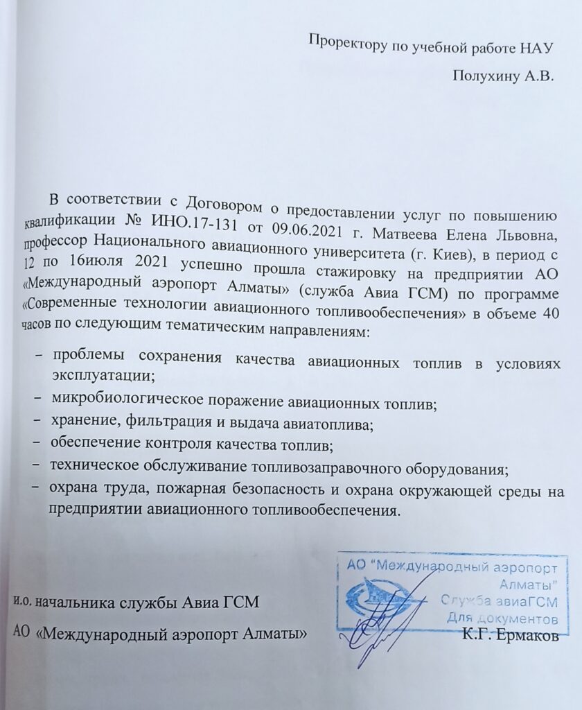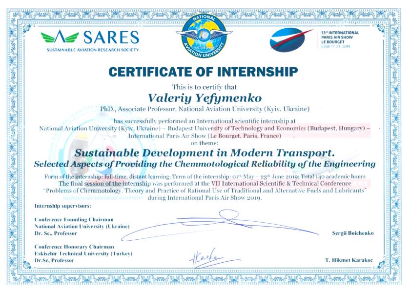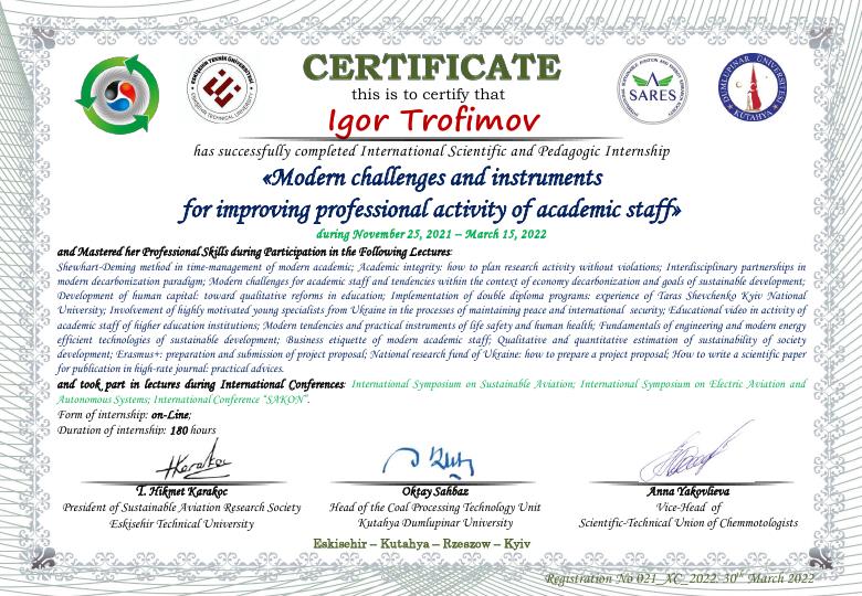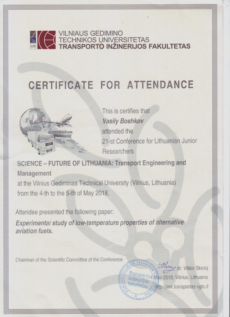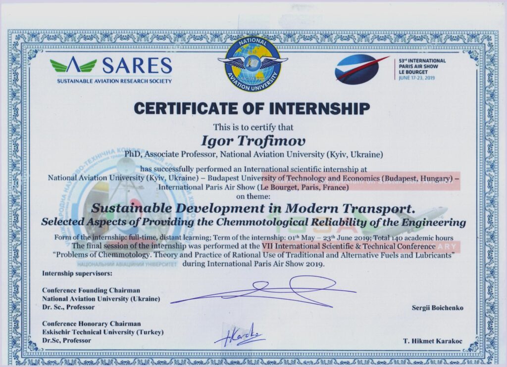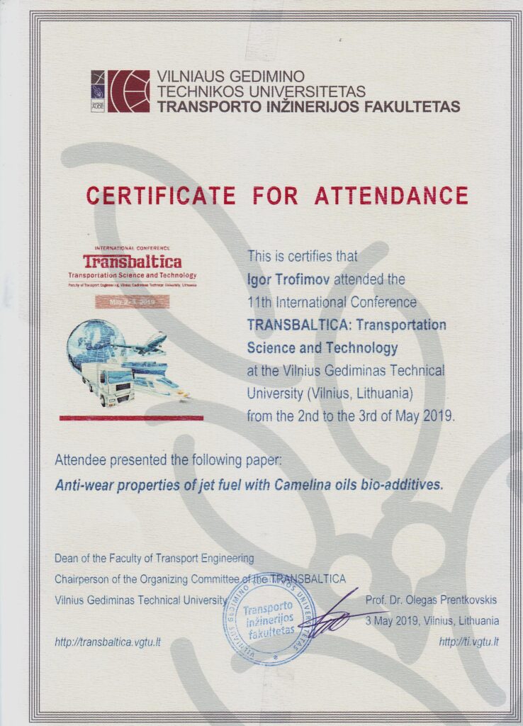 Участь к.т.н. Трофімова І.Л. у Міжнародній конференції “Трансбалтика”Міжнародне стажування к.т.н. Трофімова І.Л. за темою “Сталий розвиток на сучасному транспорті”Участь к.т.н. Трофімова І.Л. у міжнародній конференції “Проблеми хіммотології”, м. париж, ФранціяУчасть здобувача вищої освіти Бошкова Висиля у міжнародній конференції “Наука – майбутнє Литви”, м. вільнюс, ЛитваУчасть аспірантки Колмикової Н.Г. у Міжнародній науково-технічній конференціїУчасть доц. Трофімова І.Л. в міжнародному авіаційному симпозиуміМіжнародне стажування проф. Матвєєвої О.Л. за кордономУчасть проф. Матвєєвої О.Л. в міжнародній конференціїУчасть Аспірантки Вовк Юлії в міжнародній конференціїУчасть аспіранта Зінченко Руслана в міжнародній конференціїМіжнародне стажування доц. Трофімова І.Л. за кордономСертифікат доцента Єфименка В.В. на знання англійської мови “В2” Стажування доцента єфименка В.В. за кордономСертифікат Кустовської А.Д. на знання англійської мови “В2”
