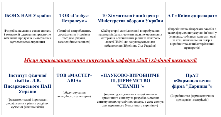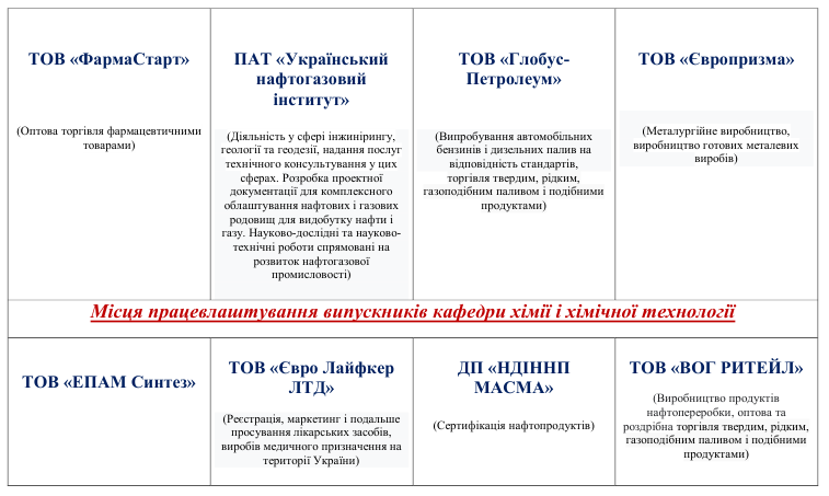 › Місця працевлаштування випускників кафедри Хімії і хімічної технології