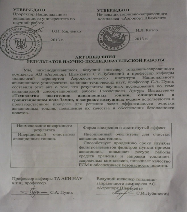 Науково-дослідницький модуль: спроектований, створений і запатентований унікальний повнорозмірний стенд, який дозволяє удосконалювати технологію підготовки авіаційних палив до заправлення ПС шляхом дослідження засобів заправлення. За допомогою повнорозмірного стенду для дослідження засобів очищення авіаційних палив стало можливим проведення експлуатаційних випробувань фільтрів і фільтроелементів. Разом з лабораторією “Експлуатаційної надійності і технологічності ПС” науково-дослідної частини НАУ була розроблена методика і проведена наукова експертиза результатів випробувань фільтроелементів.