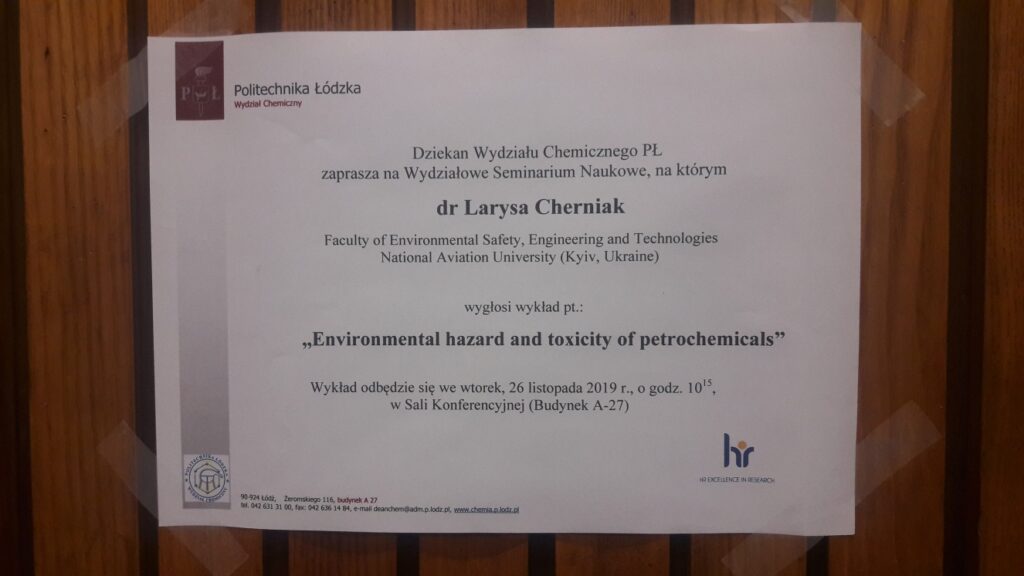 Під час візиту Лариса Черняк мала можливість прочитати курс лекцій та провести лабораторні робіт для студентів Інституту загальної та екологічної хімії, за темою, присвяченою проблемі забруднення навколишнього середовища нафтопродуктами. У той же час, під час відвідування занять польських колег Лариса Черняк мала можливість ознайомитись з кращими європейськими практиками викладання дисциплін, тематика яких пов’язана з визначенням рівня техногенного навантаження на довкілля у результаті промислової діяльності.