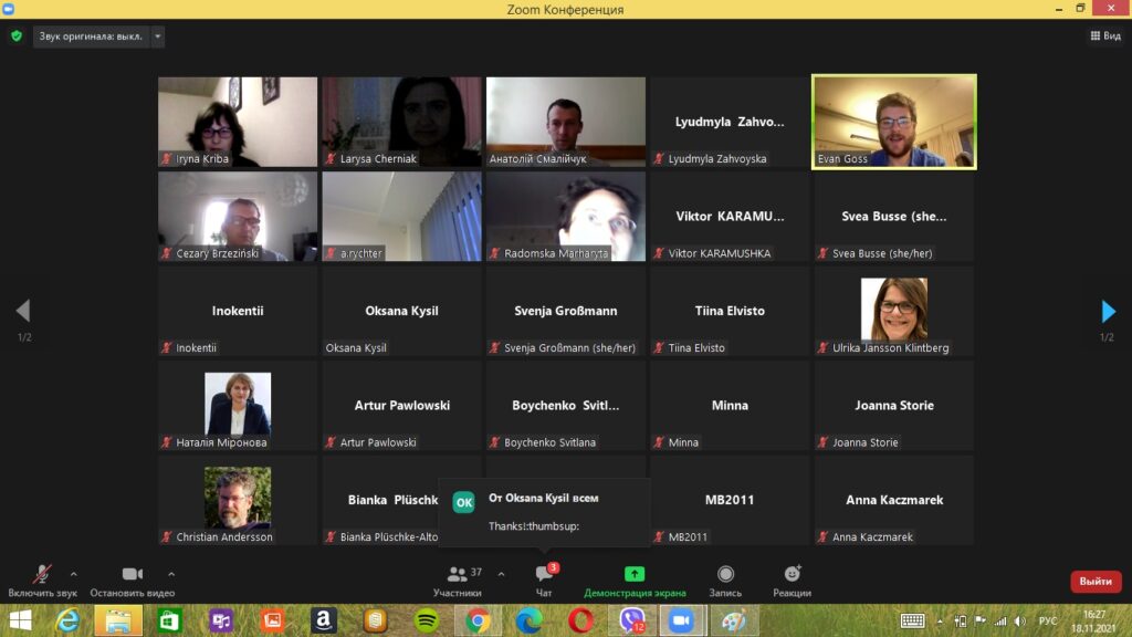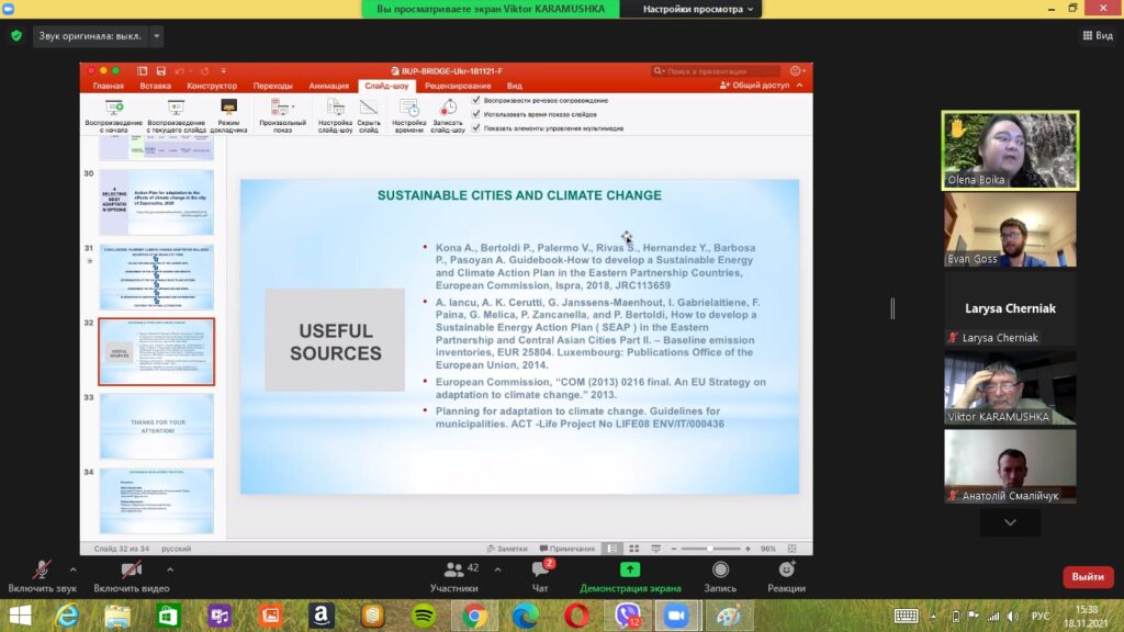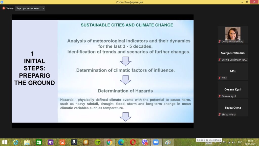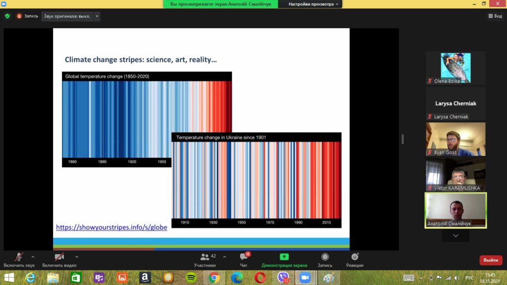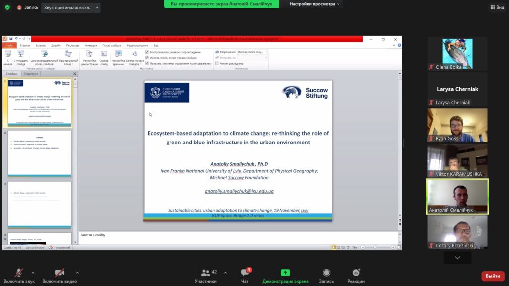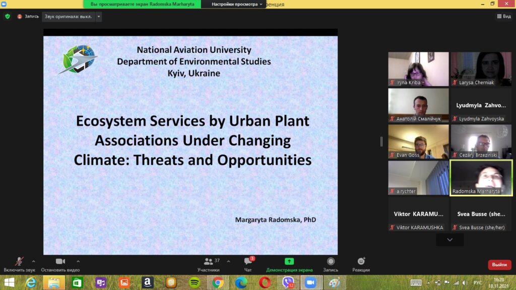 18 листопада 2021 року викладачі та аспіранти кафедри екології взяли участь у Міжнародному лекторії, що був організований Програмою Балтійських Університетів (Уппсала, Швеція) в рамках проведення “Ukrainian Space Bridge», за темою «Sustainable Cities: Urban Adaptation to Climate Change».