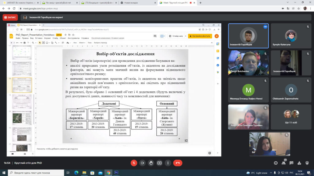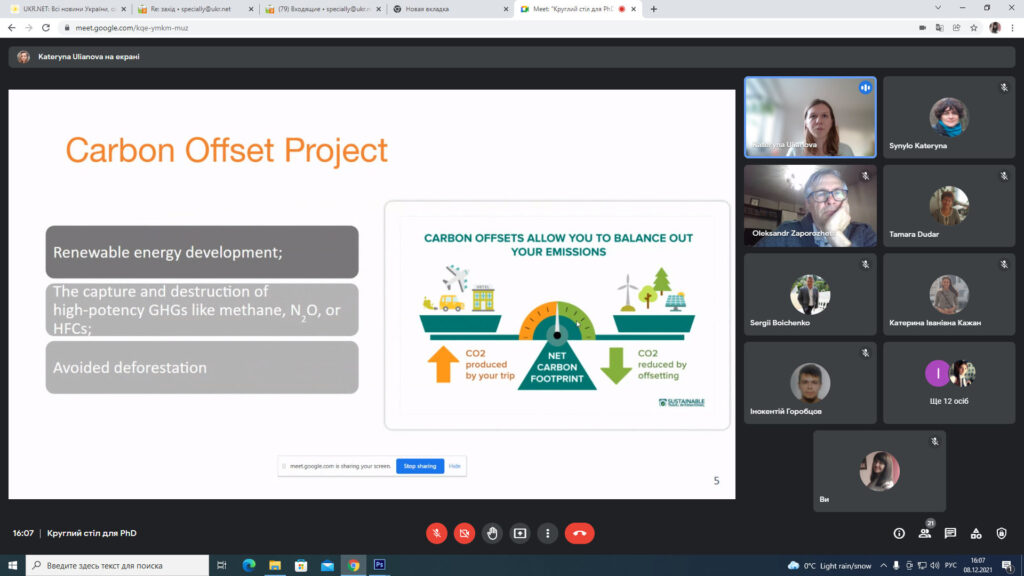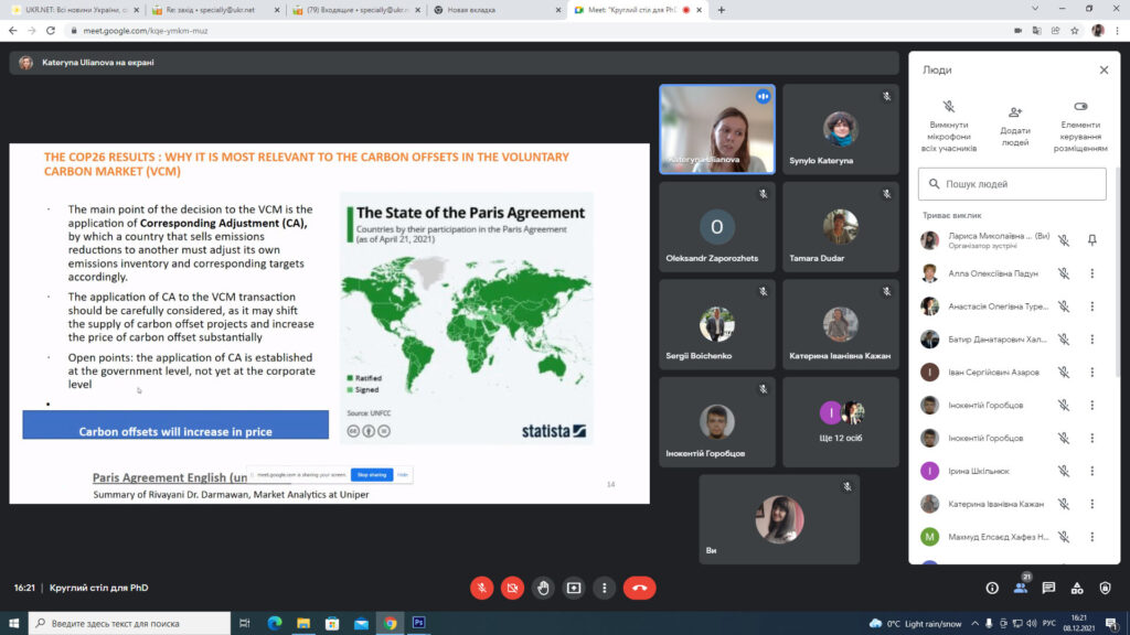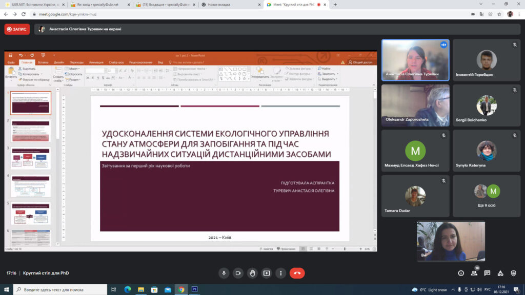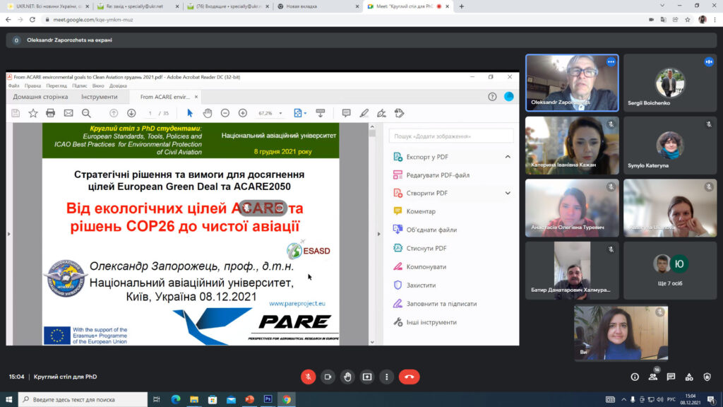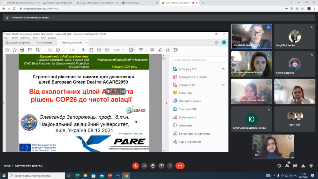 08.12.2021 року відбувся Круглий стіл для PhD під назвою “European integration of environmental standards for civil aviation”, організований в рамках виконання проекту «European Integration of Environmental Standards for Civil Aviation in the Context of Sustainable Development» міжнародної програми Jean Monnet Modules Erasmus+ у Національному авіаційному університеті, спільно кафедрами екології і цивільної та промислової безпеки. Участь у Круглому столі взяли близько 30-ти учасників.