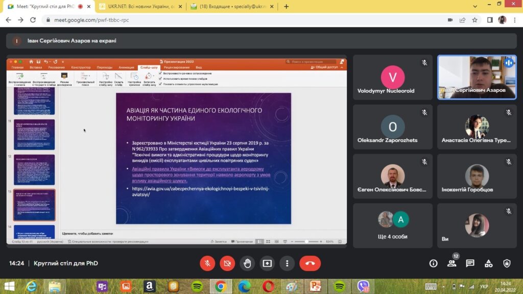 Після представлення аспірантами цікавих та змістовних доповідей на круглому столі відбулася дискусія щодо необхідності врахування у подальших науково-практичних дослідженнях нових екологічних викликів, пов’язаних з наслідками військових дій для навколишнього середовища, задля подальшого відновлення та сталого розвитку авіаційної галузі України.