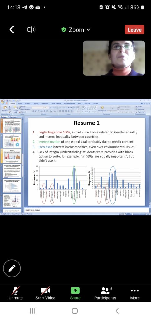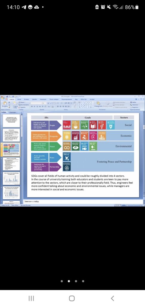 Під час засідання секції «Education for Sustainable Development Science Lab 2022» було представлено доповідь під назвою «The Perception of the Sustainable Development Goals by the Students as a Challenge For Society Transformation”, підготовлену спільно з колегами з Польщі, Швеції та Литви, які займаються питаннями дослідження проблем ефективності викладання основ Сталого розвитку у закладах вищої світи та підвищення рівня інтеграції цілей сталого розвитку у майбутню професійну діяльність фахівців різних спеціальностей.