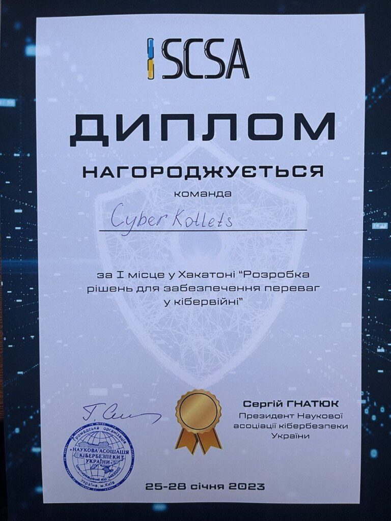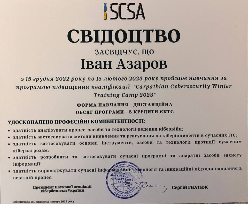 Азаров Іван, аспірант 3-го курсу навчання кафедри екології ФЕБІТ НАУ взяв участь у програмі підвищення кваліфікації «Carpathian Cybersecurity Winter Training Camp 2023» для педагогічних та науково-педагогічних працівників закладів освіти, держслужбовців, працівників галузі кібербезпеки та всіх зацікавлених, що була організована Науковою асоціацією кібербезпеки України. З 25 січня по 28 січня 2023 року на базі Готельного комплексу “Магура” в Пилипці відбулося офлайн навчання, що завершилось Хакатоном.
