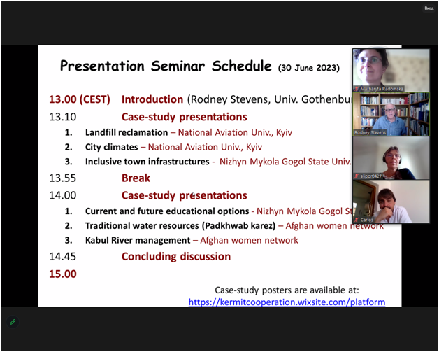 Презентації здобувачів заслухали і обговорили на панельній дискусії керівник проєкту проф. Родні Стівенс (Rodney Stevens) – професор Університету Гетеборгу, Швеція; Карлос Дуке (Carlos Duque) – провідний дослідник Університету Гренади, Іспанія; Мартін Перссон (Martin Persson) – представник Norconsult, одної з провідних консалтингових компаній Швеції у сфері інженерії, а також Елізабет Порс (Elisabet Porse) – провідний спеціаліст Департаменту управління відходами та водним господарством міста Гетеборга, Швеція. Також до обговорення долучилась Юлія Христинченко, представниця громадської природоохоронної організації «Національний екологічний центр України». Учасники дискусії прокоментували представлені проєкти, обговорили можливі шляхи розвитку тематик та окреслили перспективи для їх впровадження. Для здобувачів-авторів проєктів було дуже важливо почути думки реальних спеціалістів і професіоналів.На майбутнє проф. Стівенс запланував низку додаткових заходів для розвитку проєктів здобувачів, тож співпраця між університетами та організація учасниками має потенціалі для продовження у наступному навчальному році.
