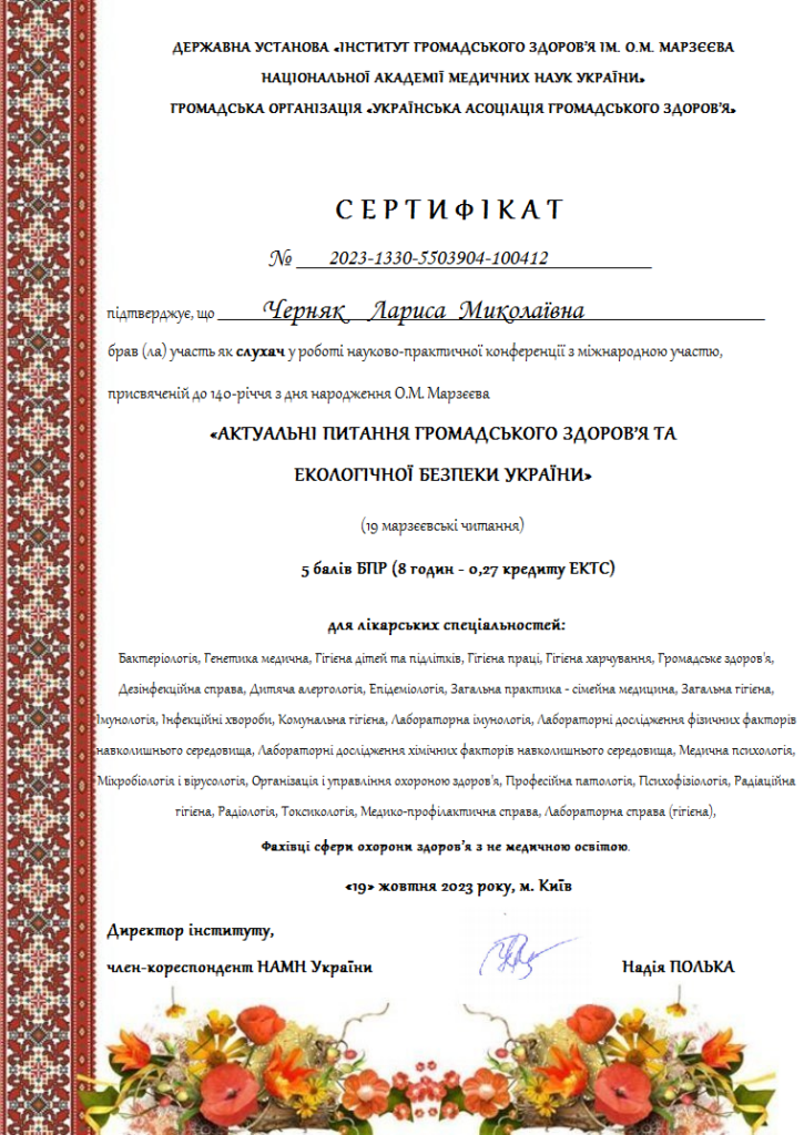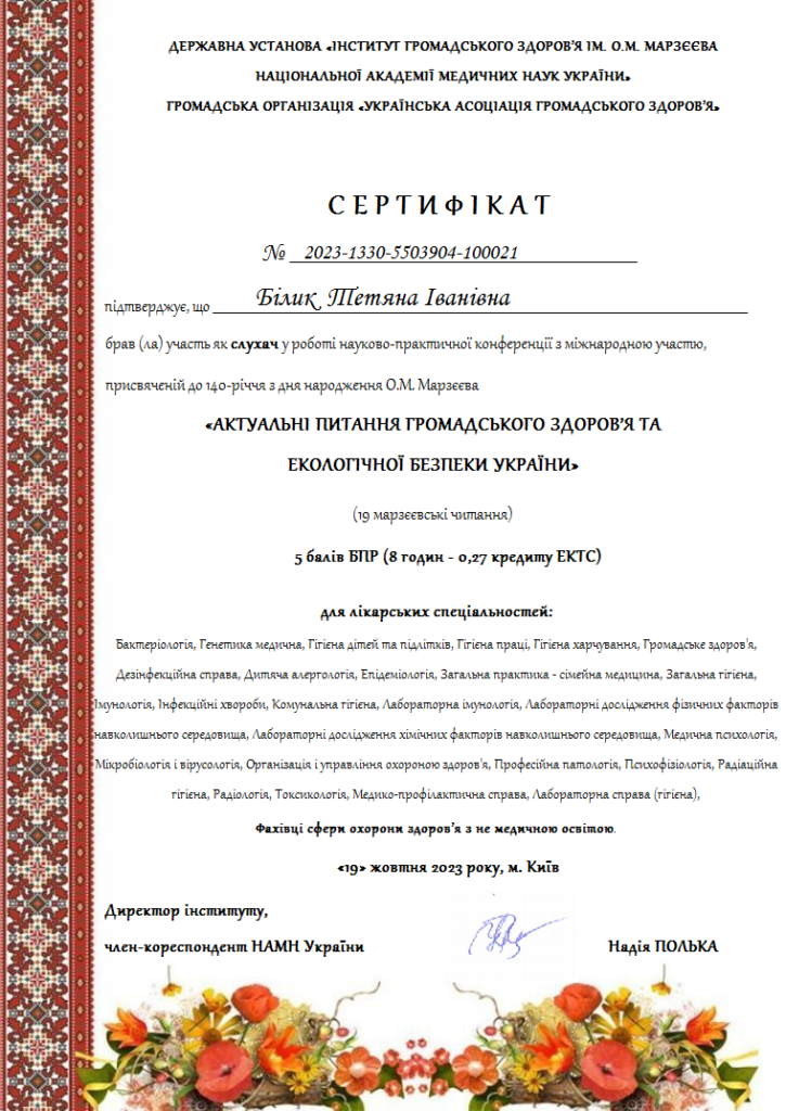 19 жовтня 2023 р. в ДУ «Інститут громадського здоров’я ім. О.М. Марзєєва НАМНУ» було проведено науково-практичну конференцію з міжнародною участю «Актуальні питання громадського здоров’я та екологічної безпеки України» (дев’ятнадцяті Марзєєвські читання).