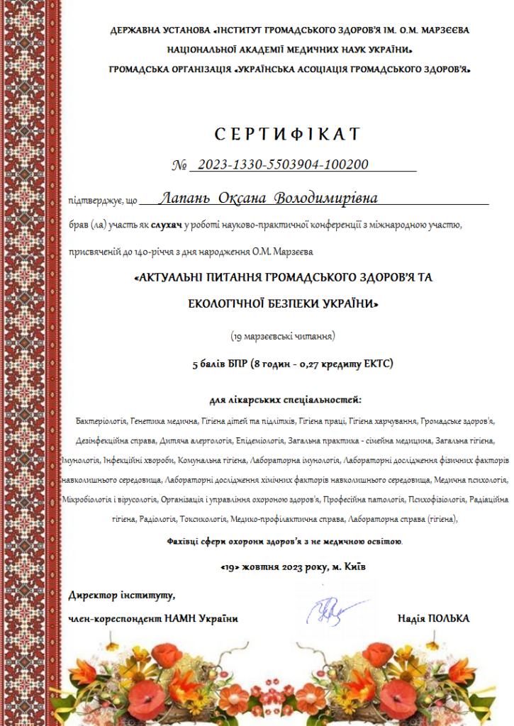 У роботі конференції взяли участь співробітники кафедри екології НАУ – Дмитруха Т.І., Черняк Л.М., Лапань О.В., Кондакова Т.С., з роботою на тему «Оцінка небезпеки забруднення ртуттю стоматологічних закладів в разі руйнування ртутних ламп», а також Білик Т.І., з роботою на тему «Небезпечність йодного дефіциту для населення в умовах воєнного стану». Учасники конференції виконували тестові завдання відповідно програмі БПР (безперервного професійного розвитку) та отримали сертифікати про підвищення кваліфікації.