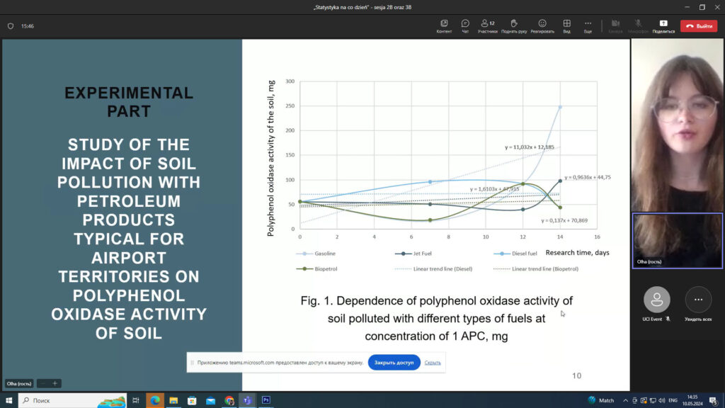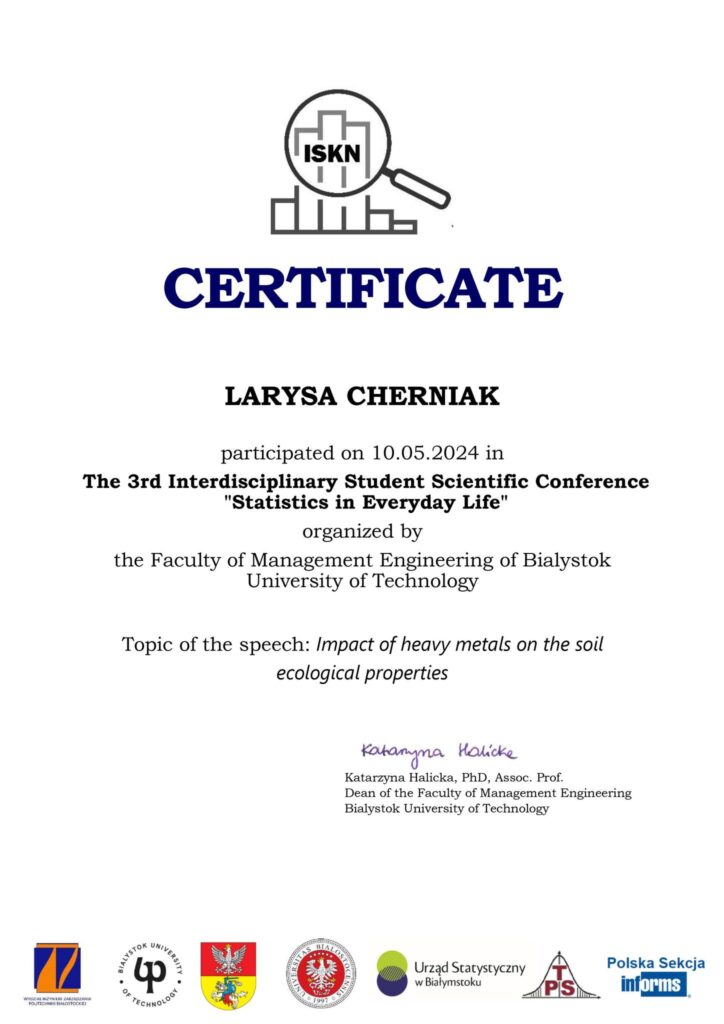 10.05.2024 року Ольга Грама, студентка 2-го курсу кафедри екології ФЕБІТ (науковий керівник доцент кафедри екології Черняк Лариса) представила результати експериментальних досліджень впливу авіаційної діяльності на навколишнє середовище у вигляді доповіді на The 3rd Interdisciplinary Student Scientific Conference «Statistics in Everyday Life», що була організована Факультетом Інженерного менеджменту Білостоцького технічного університету (м. Білосток, Польща).