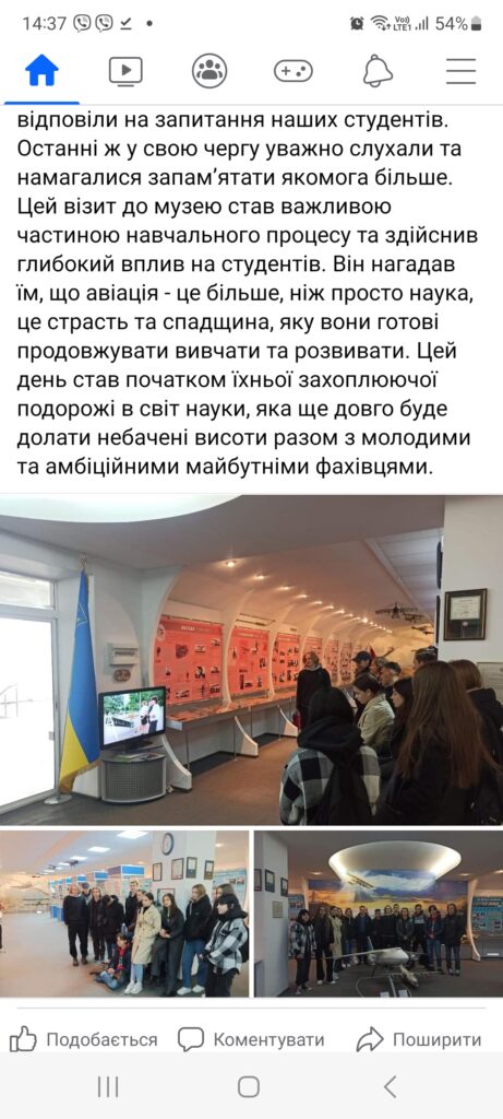 Сьогодні (10.10.2023) студенти 1 курсу кафедри біокібернетики та аерокосмічної медицини відвідали музей НАУ в рамках проведення заняття з корпоративної культури. Музей, розташований у самому серці університету, був справжнім скарбом з історії авіації. Працівники музею підготували захоплюючу екскурсію, цікаво розповіли про історію нашого університету, про перший літальний апарат, аеродинамічну трубу, школу пілотів та відповіли на запитання наших студентів. Останні ж у свою чергу уважно слухали та намагалися запам’ятати якомога більше. Цей візит до музею став важливою частиною навчального процесу та здійснив глибокий вплив на студентів. Він нагадав їм, що авіація – це більше, ніж просто наука, це страсть та спадщина, яку вони готові продовжувати вивчати та розвивати. Цей день став початком їхньої захоплюючої подорожі в світ науки, яка ще довго буде долати небачені висоти разом з молодими та амбіційними майбутніми фахівцями.