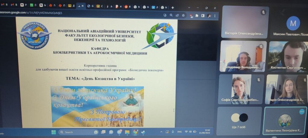 Година корпоративної культури групи БІ 409 та БМ 403 на тему ” День козацтва в Україні” в переддень такого дня пройшла з активним обговоренням історичного минулого, напруженого сьогодення та сподівання на щасливе майбутнє України (куратор та модератор Кучеренко В.Л.) ГКК відбулась 21 вересня 2023 року.