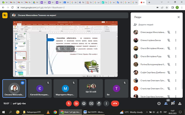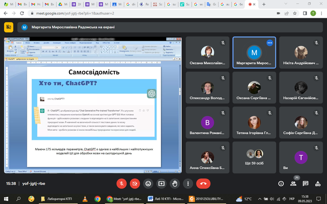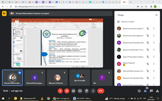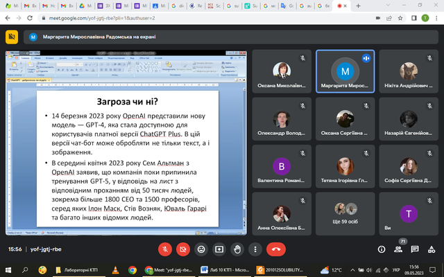 У рамках години корпоративної культури студенти групи ХП-304Б долучилися до заходу “Тиждень академічної доброчесності на ФЕБІТ” і прослухали лекції “Академічна доброчесність: основні аспекти” (Оксана Тихенко, заступник декана ФЕБІТ, д.т.н., проф.) і «Chat GPT: доброчесно чи ні?» (Маргарита Радомська, доцент кафедри екології, к.т.н., доц.). Питання, які були підняті під час лекцій, викликали активне обговорення.