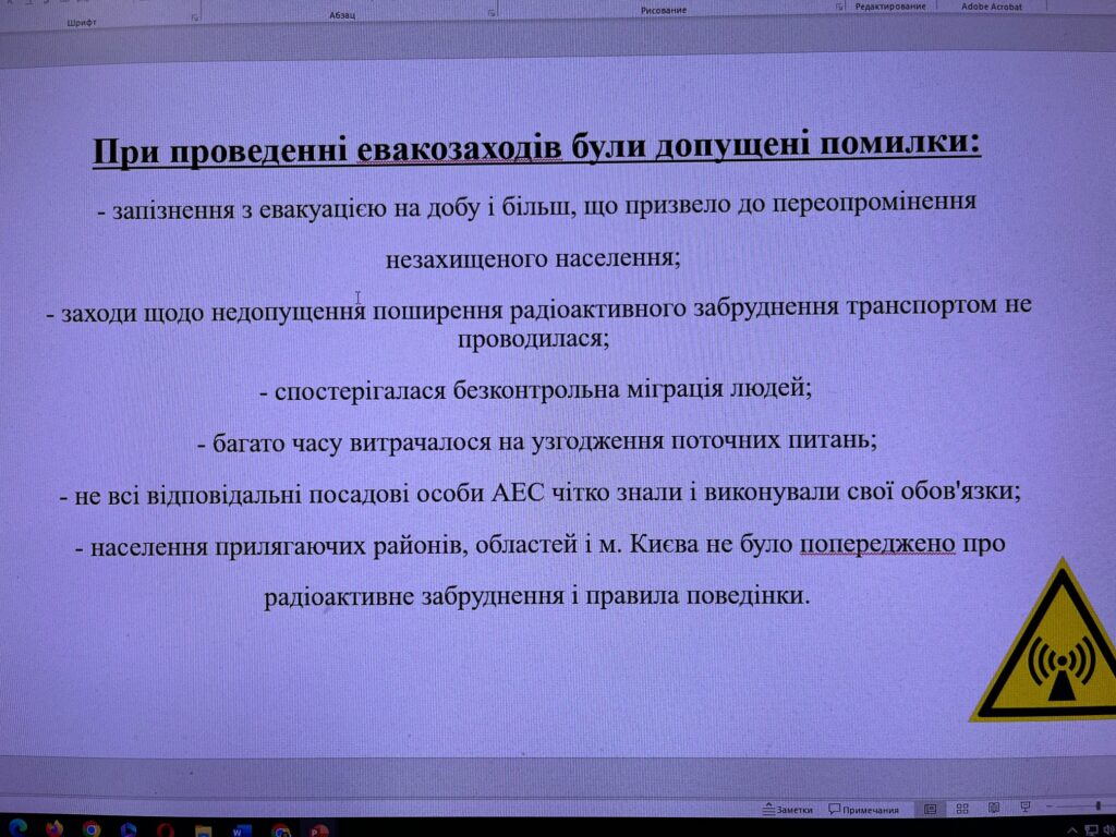 Наставник групи, Кічата Н.М., запропонувала розглянути основні етапи евакуаційних заходів, які відбувалися 38 років тому. Були проаналізовані помилки, які були здійснені та призвели до трагічних наслідків.