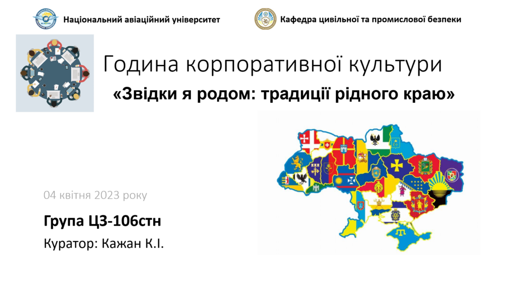 04 квітня 2023 року було проведено годину корпоративної культури за темою «Звідки я родом: традиції рідного краю». Група поділилися інформацією про традиційні цінності та звичаї рідних районів та областей України. Станіслав Ковальов розповів про рідну Рівненщину: традиційну їжу, обряди, звичаї та прикмети. Завідувач кафедри Батир Данатарович Халмурадов приєднався до зустрічі з інформацією про можливості проходження практики для студентів ЦЗ106стн та можливості працевлаштування.