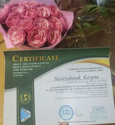 Старший викладач кафедри біокібернетики та аерокосмічної медицини ФЕБІТ  Безвершнюк Карина Олексіївна взяла участь у Міжнародному підвищенні кваліфікації «Академічна доброчесність при підготовці бакалаврів в країнах Європейського союзу та Україні» (Програма відповідає вимогам постанови КМУ від 21.08.2019 №800 зі змінами, внесеними згідно з постановою КМ №1133 від 27.12.2019), що організоване науково-дослідним інститутом Люблінського науково-технічного парку та Громадською організацією «Міжнародна фундація науковців та освітян» в режимі онлайн обсягом 45 годин (1,5 кредитів ЄКТС).