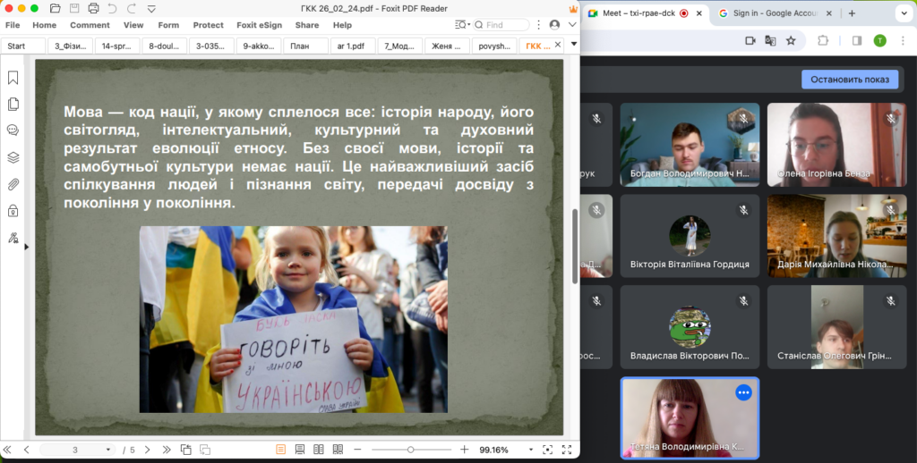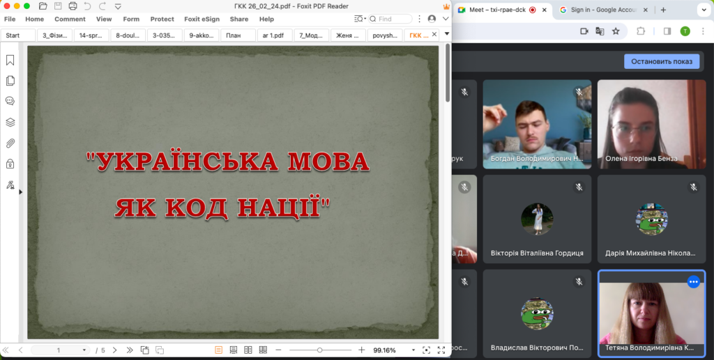 26 лютого 2024 року на кафедрі хімії і хімічної технології було проведено годину корпоративної культури для групи ХП-404Б на тему: “Українська мова як код нації”. До участі в даному заході залучилися також студенти групи АП-405Б. Під час години корпоративної культури студенти разом із куратором групи обговорили питання важливості спілкування українською мовою, її значення в існуванні та розвитку української нації та національної ідентичності.