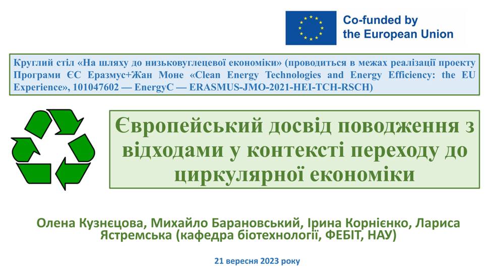 21-22 вересня 2023 р. на кафедрі біотехнології факультету екологічної безпеки, інженерії та технологій відбулась VІІ Міжнародна науково-практична конференція «Новітні досягнення біотехнології». В рамках конференції пройшов круглий стіл «На шляху до низьковуглецевої економіки» (towards low carbon economy)», що організується в межах реалізації проєкту ЄС Erasmus+, напряму Jean Monnet «Clean Energy Technologies and Energy Efficiency: the EU Experience», який отримала наукова група кафедри біотехнології ФЕБІТ НАУ, під керівництвом доцента Кузнєцової О.О.