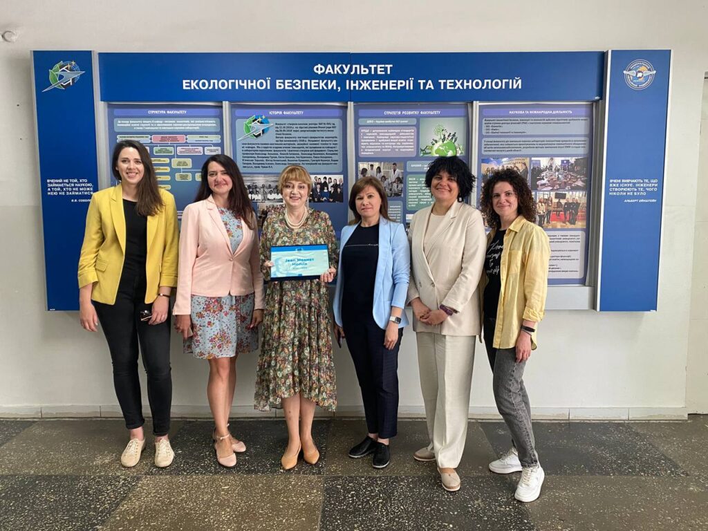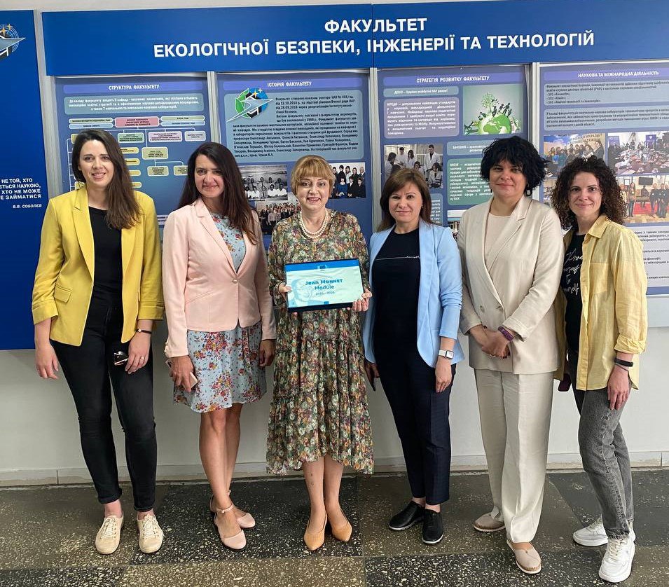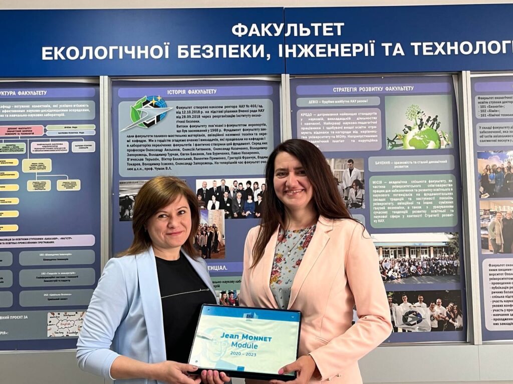 Учасники міжкафедрального проекту «European Integration of Environmental Standards for Civil Aviation in the Context of Sustainable Development N° 621138-EPP-1-2020-1-UA-EPPJMO-MODULE Jean Monnet Module, 2020 – 2023», що завершується у жовтні 2023 року, передали декану ФЕБІТ, д.т.н., проф. Ірині МАТВЄЄВІЙ пам’ятну дошку перших переможців з ФЕБІТ конкурсу Erasmus +Jean Monnet Module.