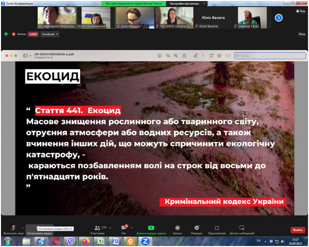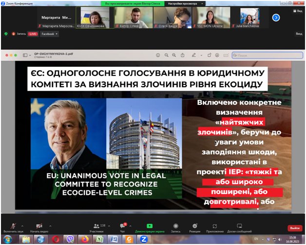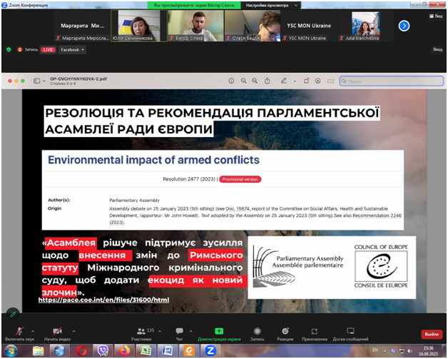 Молоді дослідники обговорили стратегію просування даної ідеї на національному та європейському рівні. Також були представлені пропозиції науковців для нейтралізації наслідків екоциду в Україні, що можуть бути використані при обрахунку розміру відшкодування на відновлення навколишнього природного середовища країни.