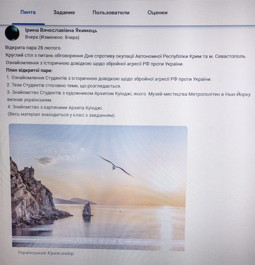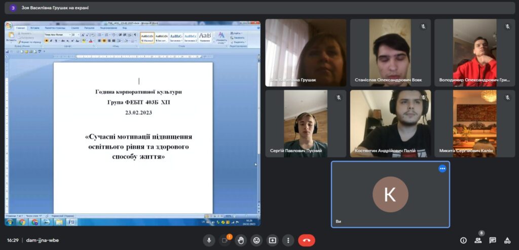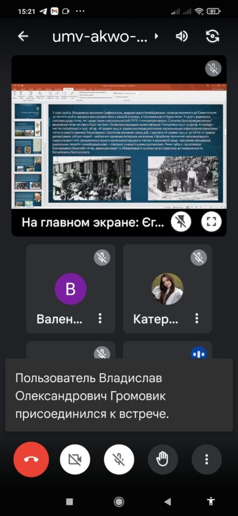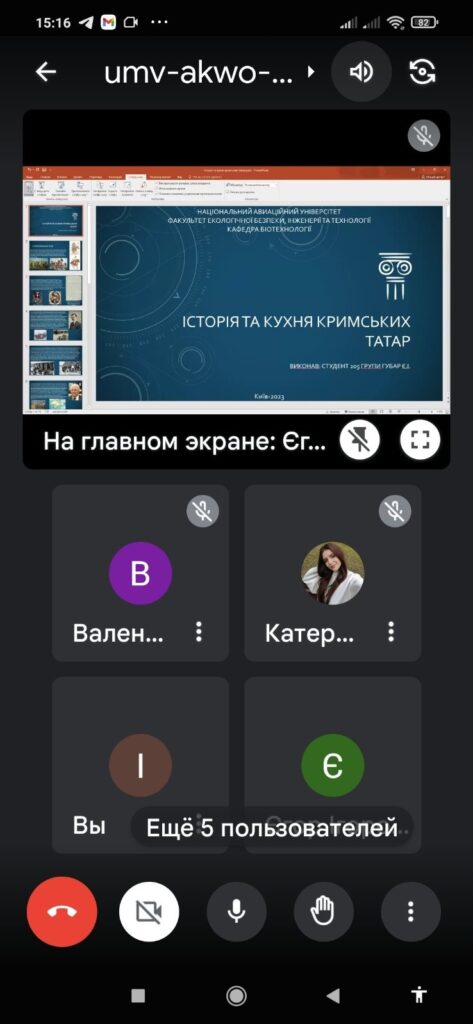02 березня 2023 року відбулася відкрита година корпоративної культури для групи БТ-205 Б (спеціальність – 162 «Біотехнології та біоінженерія») на тему: «Історія розвитку автономної республіки Крим та її національні традиції». Під час обговорення даної теми, доповідачами – Єгор Губар та Валентина Ляшко – було представлено презентації для висвітлення даної тематики. Здобувачі вищої освіти (Єгор Губар та Валентина Ляшко) поділилися історією зародження та формування кримськотатарського народу, познайомили слухачів із національними традиціями та кухнею. Єгор Губар в своїй доповіді акцентував увагу слухачів на історію формування Кримського ханства – держави, яка існувала на півострові від 1441 до 1783 рр. У 1783 р. Згідно історичних фактів, внаслідок перемоги Росії над Османською імперією, Крим був окупований, а потім анексований цією державою. Це було початком доби в історії кримських татар, яку багато хто з них називають «чорне століття», яке нажаль, знову повернулося, починаючи із 2014 року. Утиски з боку російського самодержавства та експропріація землі у кримськотатарських селян спричинили їхню масову міграцію до Османської імперії. Інтенсивні українсько-кримськотатарські контакти в політичній та військовій сферах почалися, коли гетьман Богдан Хмельницький уклав договір із кримським ханом щодо допомоги в національно-визвольній боротьбі українців проти Речі Посполитої.