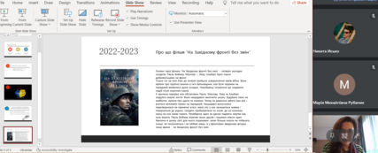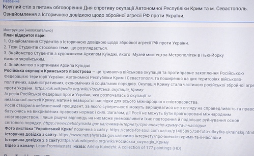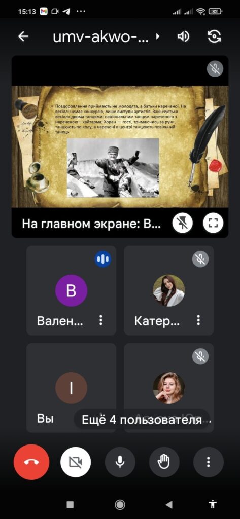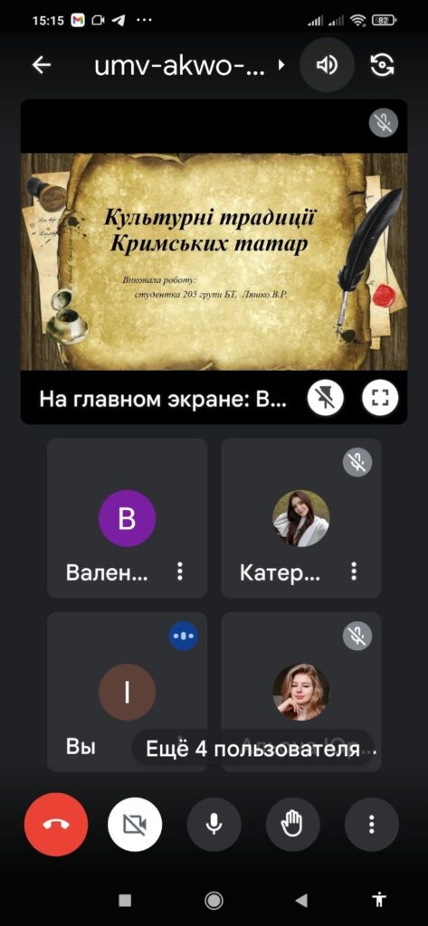 Доповідач ознайомила нас із особливостями кримсько-татарського весілля, на якому немає конкурсів, лише виступи артистів. Весілля закінчується двома танцями: національним танцем нареченого з нареченою – хайтарма. Здобувачі продемонстрували творчі роботи та розповіли про свої власні позиції щодо висвітленого питання. На їх спільну думку, кримсько-татарський народ має непросту історію та найбагатшу культуру, яка, без сумніву, робить Крим ще більш унікальним та цікавим.