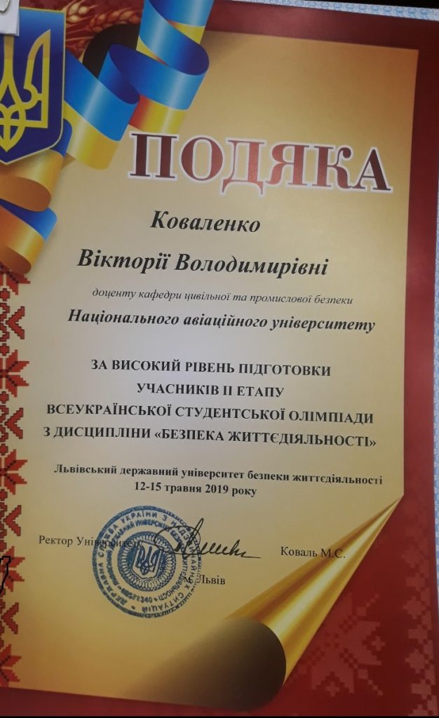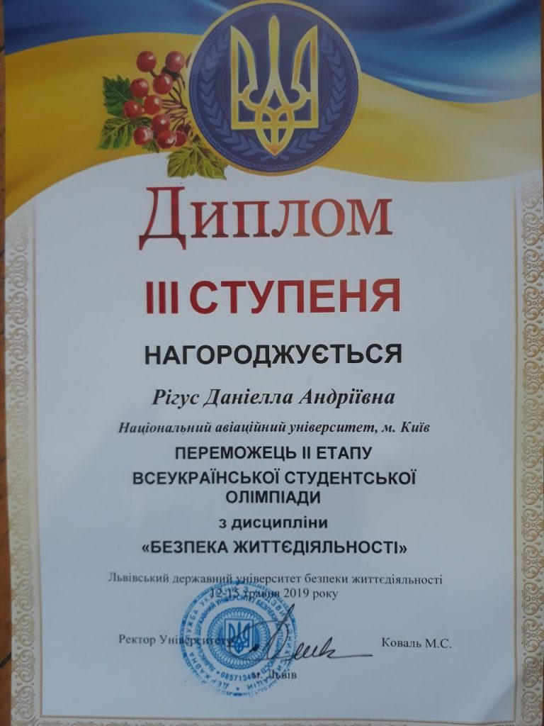 12-15 травня на базі Львівського державного університету безпеки життєдіяльності (м. Львів) відбувся ІІ етап Всеукраїнської олімпіади з дисципліни Безпека життєдіяльності. В олімпіаді прийняли участь 124 студента з 52 закладів вищої освіти України. Національний авіаційний університет представляли студентки 2 курсу ФЕБІТ Рігус Даніелла (ЦЗ-210) та Левчук Ірина (ЦЗ-210), керівник – доцент кафедри цивільної та промислової безпеки Коваленко В.В.