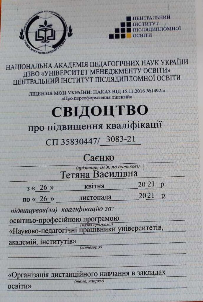 Викладачі кафедри екології ФЕБІТ доцент Падун А.О. та професор Саєнко Т.В. були слухачами курсів підвищення кваліфікації за напрямом “Організація дистанційного навчання в закладах освіти”. Навчання за індивідуальною освітньою траєкторією (180 годин) дозволило успішно набути інтегральні компетенції, захистити випускну роботу та отримати свідотство. Головними результатами таких курсів підвищення кваліфікації є ознайомлення з сучасними науково-методичними і психолого-педагогічними розробками та практичні навички щодо впровадження в процесі викладання педагогічної технології, основою якої є широке застосування сучасних інформаційно-комунікаційних технологій.