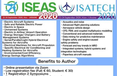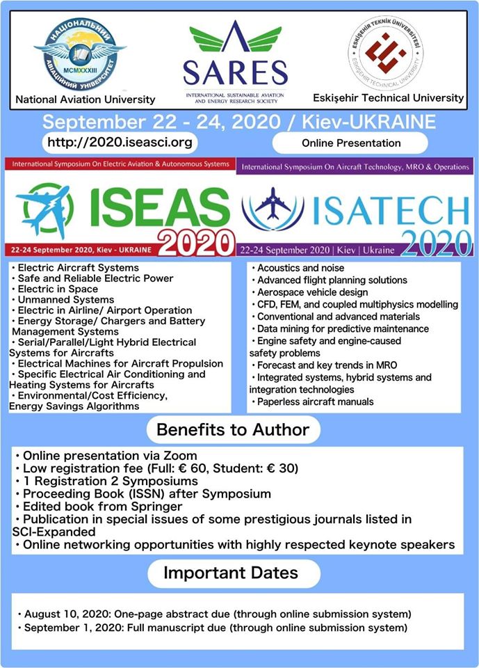 Приглашаем Вас на Международный симпозиум по электроэнергетике и автономным системам (ИСЕАС) и Международный симпозиум по авиационной технологии, МРО и операциям (ИСАТЕХ), который пройдет в основном в формате ′′ онлайн симпозиума по приложению Zoom “. Дополнительную информацию можно получить на сайте симпозиума:2020.iseasci.org