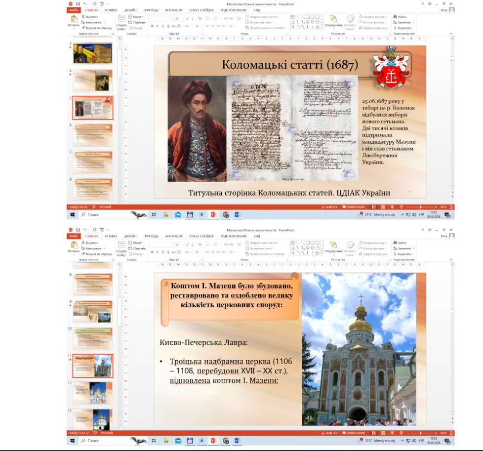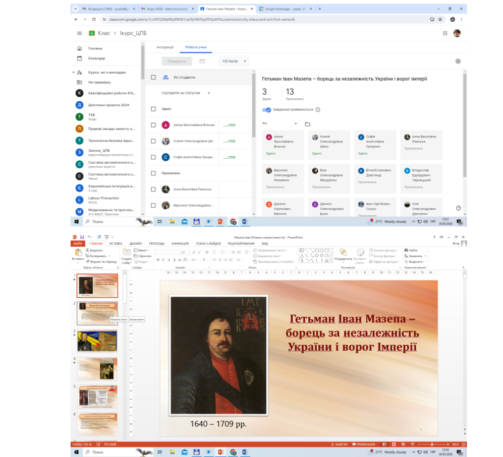 У квітні 2024 року відбулася година корпоративної культури для групи ЦПБ- 205 (спеціальність – 263 ««Захист об’єктів критичної інфраструктури») на тему: «Гетьман Іван Мазепа – борець за незалежність України і ворог Імперії». Наставник групи Синило К.В. представила презентацію, яка була присвячена супротиву та боротьби України за свій суверенітет.