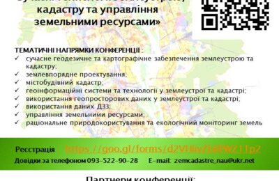 Шановні колеги та студенти! Триває реєстрація на VІ щорічну Всеукраїнську науково-практичну конференцію «Сучасні технології землеустрою, кадастру та управління земельними ресурсами», яка проходитиме 12-13 березня 2020 року в Національному авіаційному університеті.