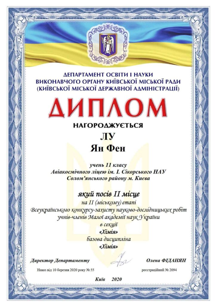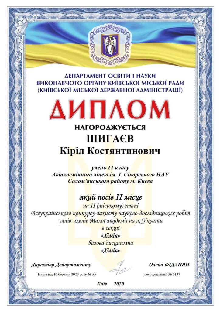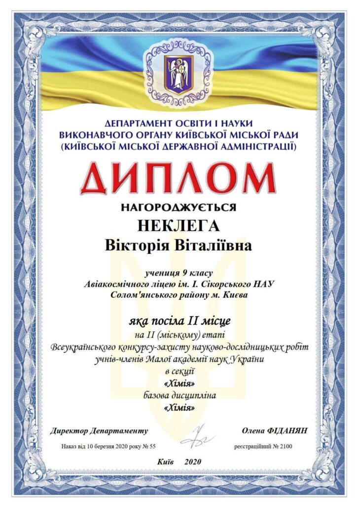 А учні 9-11 класів знову готують учнівські наукові роботи і беруть участь в конкурсах МАН. Так, цього року переможцями ІІ (міського) етапу Всеукраїнського конкурсу-захисту науково-дослідницьких робіт учнів-членів Малої академії наук України в секції «Хімія» стали наступні учні Авіакосмічного ліцею НАУ: